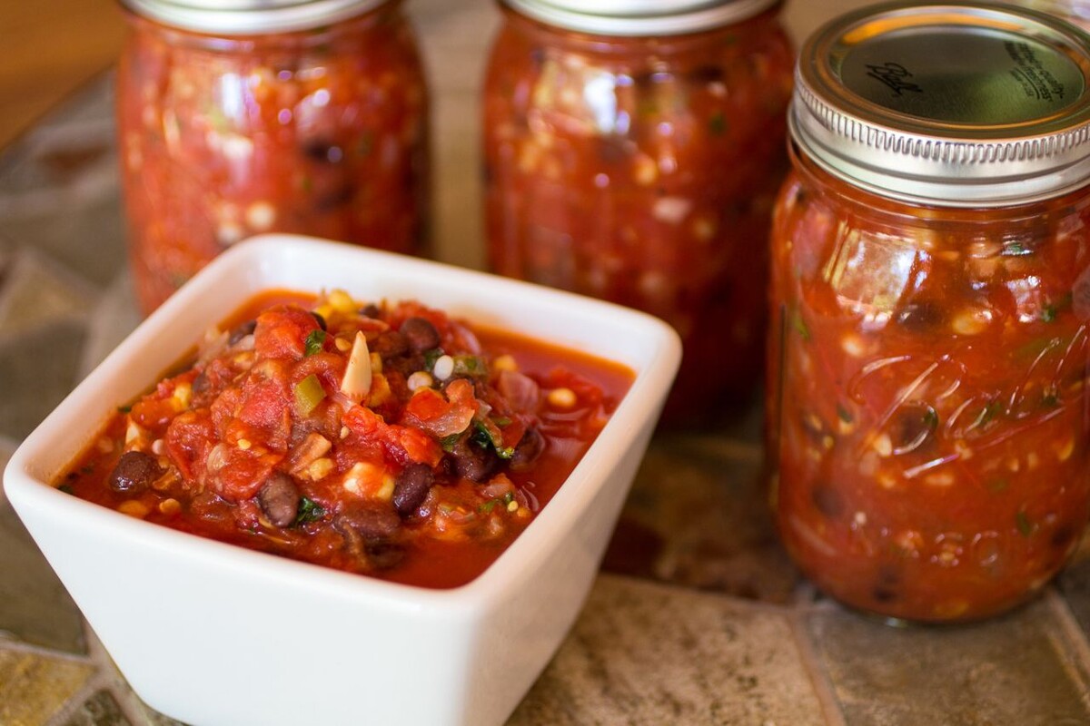Ингредиенты: - 1,5 кг помидор - 0,5 кг моркови - 0,5 кг репчатого лука - 0,5 кг белокочанной капусты - 0,5 кг очищенных кабачков - 750 гр болгарского перца - 250 мл томатного соуса - 175 мл растительного масла - 1 ст. ложка с горкой соли - 2,5 ст. ложки сахара - 600 гр фасоли - 3 ст. ложки соуса "Сладкий чили" - пучок петрушки - головка чеснока 1. Фасоль замочить на ночь, отварить и промыть. 2. Репчатый лук нарезать кубиками. 3. Обжарить его на растительном масле. 4. Добавить нарезанную кубиками морковь и соус "Сладкий чили". Тушить до мягкости моркови. 5. Затем добавить пропущенные через мясорубку помидоры и дать закипеть. Добавить нарезанные кубиком кабачки, нашинкованную капусту, томатный соус и все немного потушить под крышкой. 6. Затем положить нарезанный соломкой болгарский перец. 7. Далее соль, сахар и тушим 5 минут. 8. Выкладываем подготовленную фасоль. 9. Добавляем нарезанную петрушку и чеснок. 10. Перемешиваем, добавляем 1 ч. ложку уксусной эссенции, молотый черный перец