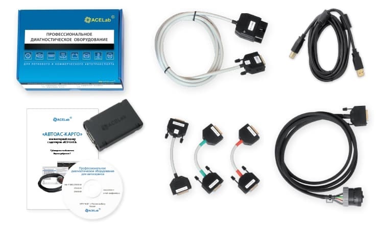 Специализированный компьютерный сканер «АВТОАС-КАРГО» (комплект 2021) для диагностики грузовых автомобилей, автобусов и спецтехники, таких как: МАЗ, ГАЗ, ПАЗ, КАвЗ, ЛиАЗ, УРАЛ, КрАЗ, ЗИЛ, НефАЗ, МЗКТ, Hyundai, Fuso, Fiat, Iveco, PSA и другие. В комплект входят: адаптер «ECU-Link 3», диагностические кабели «OBD-II 24», «SAE J1939», переходники «DB15-CAN R», «DB15-ECU57», «DB15-D4DD», «DB15-WP». » USB-кабель длиной 3 метра, а также инсталляционный CD-диск. Основные режимы работы программы-сканера «АВТОАС-КАРГО»: Выбор диагностируемого двигателя/системы Считывание, расшифровка и стирание кодов неисправностей - в этом режиме осуществляется считывание и обнуление кодов неисправностей (ошибок) регистрируемых ЭБУ диагностируемой системы. На экран выводятся цифровые коды ошибок, статус обнаруженных ошибок (текущие, периодические) и их расшифровка. Контроль параметров - отображение параметров работы диагностируемой системы в режиме реального времени. Программа позволяет просматривать параметры