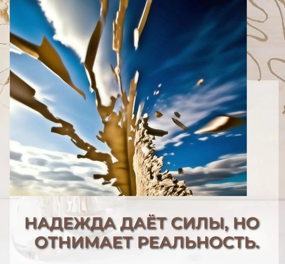 Хочу более подробно раскрыть свою мысль. Надежда очень коварное чувство. Когда есть надежда на лучшее, появляются силы терпеть, ждать, стараться. Когда мы надеемся, что нас повысят, мы прилагаем больше усилий для реализации этого, у нас поднимается настроение, когда мы находим этому подтверждение. Когда мы надеемся на выздоровление близких людей, у нас появляются силы и терпение ждать этого, искать варианты лечения и, даже, мотивировать самого больного. С этим все понятно. Почему же надежда отнимает реальность? Я бы сказала, что не любовь слепа, а надежда. В надежде на лучшую жизнь, мы терпим принебрежительное отношение к себе. Мы выходим на работу в выходные, выполняем чужие обязанности, хотя, предпосылок к повышению никаких нет, кроме, мимолетного замечания руководителя. Женщина тратит свою жизнь, молодость, здоровье в ожидании, что её муж-алкоголик бросит пить и они будут жить той жизнью, которую ей обещали. Мужчина может сидеть и ждать, что жена одумается и вернётся, хотя у не