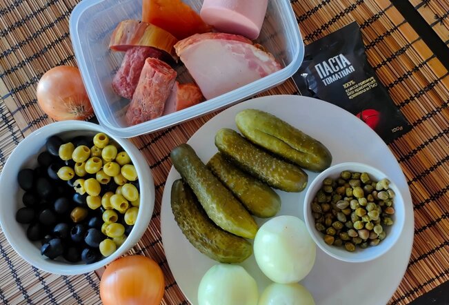 Ингредиенты на 6 порций супа: 2л Бульона 150г Копченой колбасы 150г Говядина сыровяленая 150г Варено-копченая говядина 150г Копченая куриная грудка 150г Варено-копченая колбаса 1 банка Оливок без косточек 1 банка Маслин без косточек 1 банка Каперсов 3 штуки Картофеля 6 штук Репчатый лук 6 штук Соленых огурцов 6 штук Маринованных огурцов 1 чайная ложка Черный перец с лимонной цедрой 1 штука Лимон 2 штуки Лавровый лист 2л Вода 100г Томатная паста 100мл Растительное масло 100г Сметана 1. Подготовить все основные ингредиенты (маринад от оливок, маслин, каперсов и огурцов сохранить, он понадобится). 2. Лук нарезать полукольцами 3. На растительном масле обжарить лук сразу в кастрюле, в которой будет вариться солянка. Жарить можно на сильном огне около 5–7 минут. 4. Пока лук обжаривается, нарезать огурцы кусочками среднего размера. 5. Когда лук станет прозрачным, в кастрюлю высыпать огурцы. 6. Все тщательно перемешать и убавить огонь до среднего, потушить лук с огурцами 5–7 минут. 7. В туш