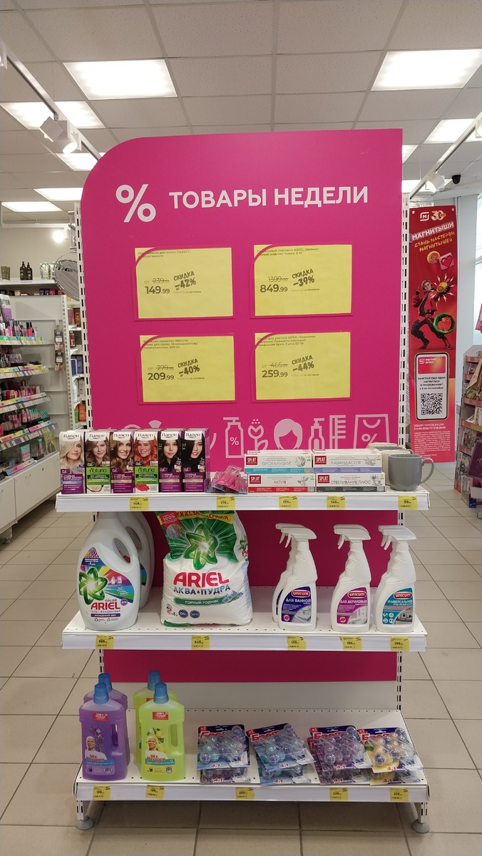 Всем привет, мои дорогие друзья, подписчики и гости моего канала.В Магнит Косметик началась новая неделя скидок. Магазин находится по адресу Ростовская область, Зерноградский район, станица Мечетинская, улица Ленина, 50 Неделя скидок продлится с 18 до 24 сентября 2024 года. Краска для волос Палетт в ассортименте цена со скидкой 149.99 руб. Зубная щётка Splat Professional средняя цена со скидкой 179.99 руб. Зубная паста Splat Professional в ассортименте цена со скидкой 179.99 и 145.99 руб. Кружка ребро, 350 мл, фарфор цена со скидкой 99.99 руб. Гель -концентрат для стирки Ариэль насыщенный цвет цена со скидкой 899.99 руб. Стиральный Порошок Ариэль, Аква пудра, горный родник, 1,5 кг цена со скидкой 849.99 руб. Средство для уборки ванной комнаты UNICUM , 500 мл цена со скидкой 159.99 руб. Средство для чистки акриловых ванн и душевых кабинок, Unicum, 500 мл цена со скидкой 186.99 руб. Моющее средство Универсальное Unicum, 500 мл цена со скидкой 199.99 руб. Бреф блок для унитаза