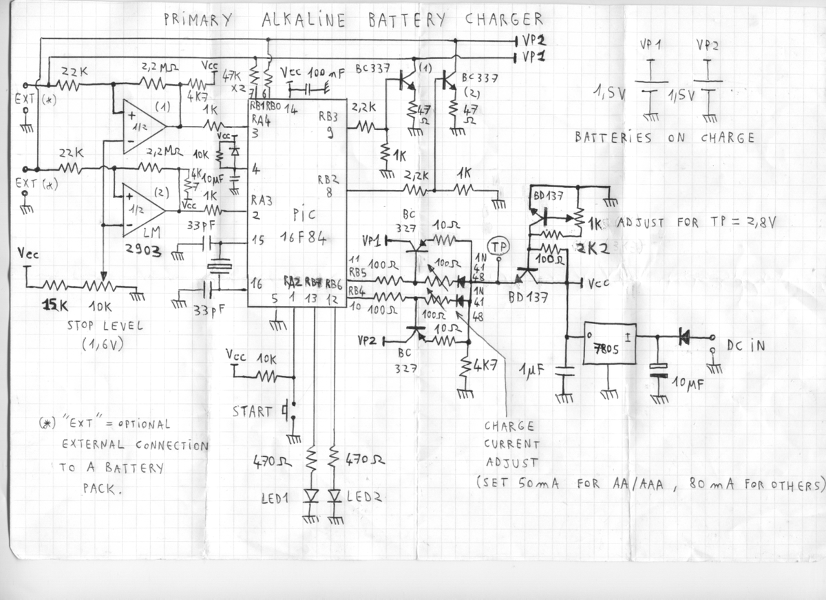 Часть аппарата, производящая импульсы и контролирующая их воздействие сделана на основе микроконтроллера Microchip PIC16F84. Когда я разработал это устройство, он был один из самых известных в мире любителей электроники микроконтроллеров. Источник код программы также как и HEX file можно скачать и изменить для любого PIC16FXX микроконтроллера. (Сегодня вы можете например адаптировать принцип на платформе Arduino). Предлагаемый аппарат может заряжать одновременно и независимо две 1.5в батарейки. Также, стоит отметить: