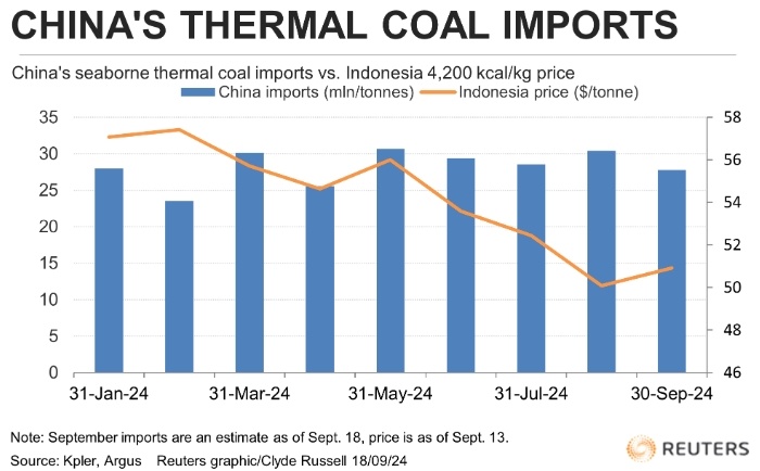 Импорт морского энергетического угля в сентябре также ожидается на высоком уровне: Kpler оценивает его в 27,77 млн тонн. Вероятно, эта цифра будет пересмотрена в сторону повышения по мере оценки дополнительных партий к концу месяца.