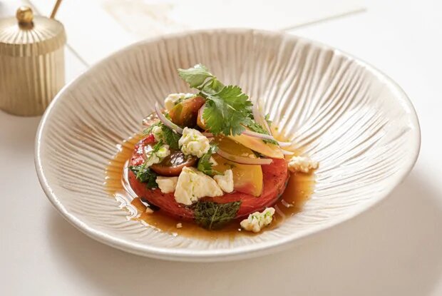 1.Приготовить соус: смешать мед, соевый соус, горчицу, бальзамический крем и растительное масло. 2.Арбуз разрезать на шесть пластов круглой формы, напоминающей тарелку. 3.Убрать лишние семечки. 4.Разогреть гриль. 5.Смазать маслом стейки. Обжарить каждый с двух сторон на гриле в течение 1–2 минут. 6.Посыпать стейки солью. 7.Приготовить салат: томаты помыть и нарезать произвольно. 8.Кинзу и мяту произвольно покрошить. 9.Красный лук нарезать соломкой. 10.Сыр произвольно поломать. 11.Смешать все ингредиенты и заправить соусом. При необходимости немного досолить. 12.Собрать блюдо: стейк из арбуза положить на тарелку, сверху выложить салат. 13.Подавать. Заходите чаще на наш канал! Каждый день новые и акту