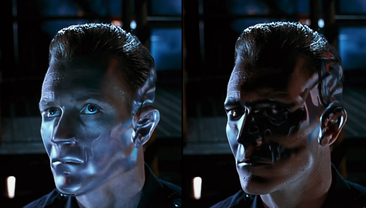 В сцене на сталелитейном заводе можно заметить блестящий от пота лоб Т-800, что объясняется очень просто – у него настоящая человеческая кожа. В то же время Т-1000 совсем не потеет, потому что изготовлен из жидкого металла.