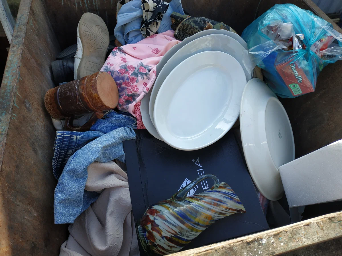 А вот появляются неизвестные лица на сцене - кто-то купил квартиру и затеял ремонт, и целый день таскает к бакам всякое-разное - старые чемоданы, одежду, посуду, книги, раковины и кровати. При чем складывают всё это аккуратно рядом - вдруг кому-то нужно.