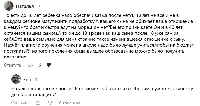 Помню, когда написала статью о том, что не беру сына 18 лет с собой на море, на меня посыпались комментарии - не только позитивные. Многие охали, как так можно собственного ребенка кинуть.
