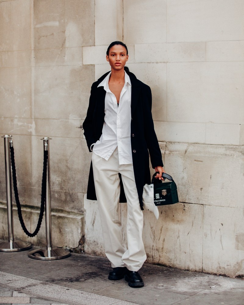 На днях завершилась Неделя моды весна-лето 2025 в Лондоне и уже переехала в Милан. До главных итальянских трендов мы еще обязательно доберемся, а пока я хотел бы разобрать образы гостей английских показов. На удачу, погода в Лондоне уже по-настоящему осенняя, а потому и стритстайлы были действительно актуальными для сезона — с пальто, куртками и трикотажем. Выделил семь аутфитов, которые можно брать на заметку в ближайшие месяцы. Всегда выигрышная формула удачного аутфита — особенно, когда нет времени на эксперименты: два базовых цвета плюс минималистичный крой. Так что в мастхэвы осени добавляем белую рубашку, прямые брюки, классическое черное пальто и лоферы. Свободный плащ — то, без чего вообще трудно представить межсезонье. Кто-то считает его мейнстримом, а по мне — это база, которую легко стилизовать, а потому делать каждые образы разными. На фото отличный вариант с бермудами, которому добавили женственности и выразительности яркими босоножками. Модели с отложным воротником стали