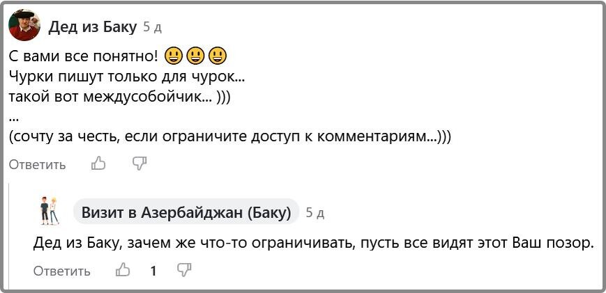 Так например, я уже пятый день веду дискуссию на одной из статей о бакинских архитекторах с человеком, который считает, что здесь собрался какой-то "междусобойчик".