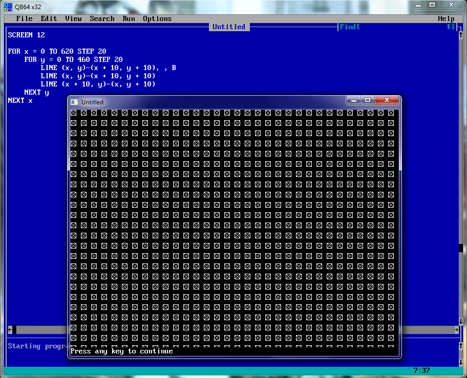 Мы, вместо того, чтобы указывать абсолютные координаты, пишем «X + 10» и «Y + 10». То есть указываем координату относительно имеющимся значениям X и Y. Зачем это понадобилось? Затем, что мы привязали квадрат к координате его левого верхнего угла. Координату правого нижнего угла мы получаем относительно левого верхнего. Это нужно для того, чтобы рисовать в цикле – достаточно зациклить только две переменные: X и Y.