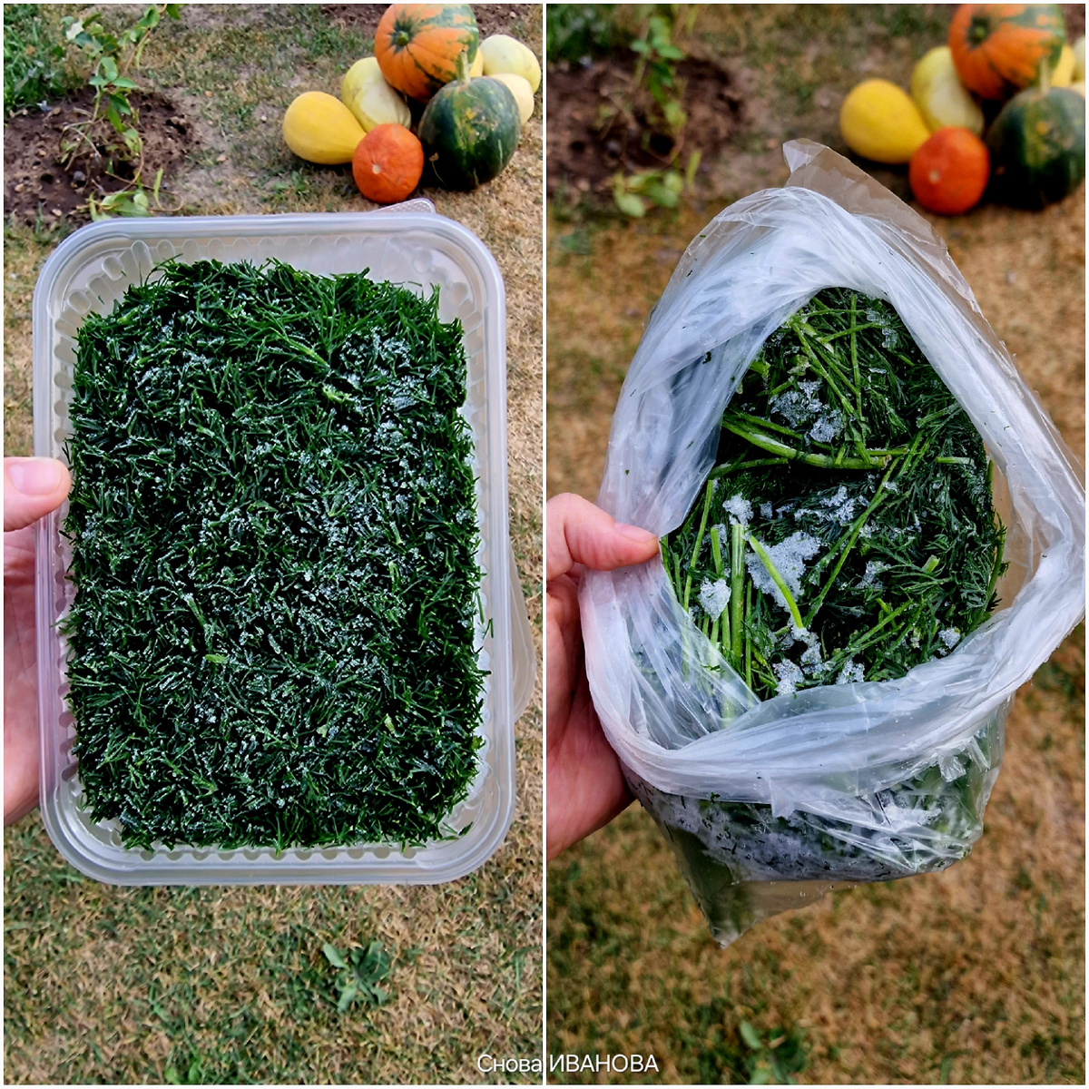 Стебли укропа при заготовке листьев не выбрасываем, а также замораживаем из них можно приготовить вкусную заправку для салата.