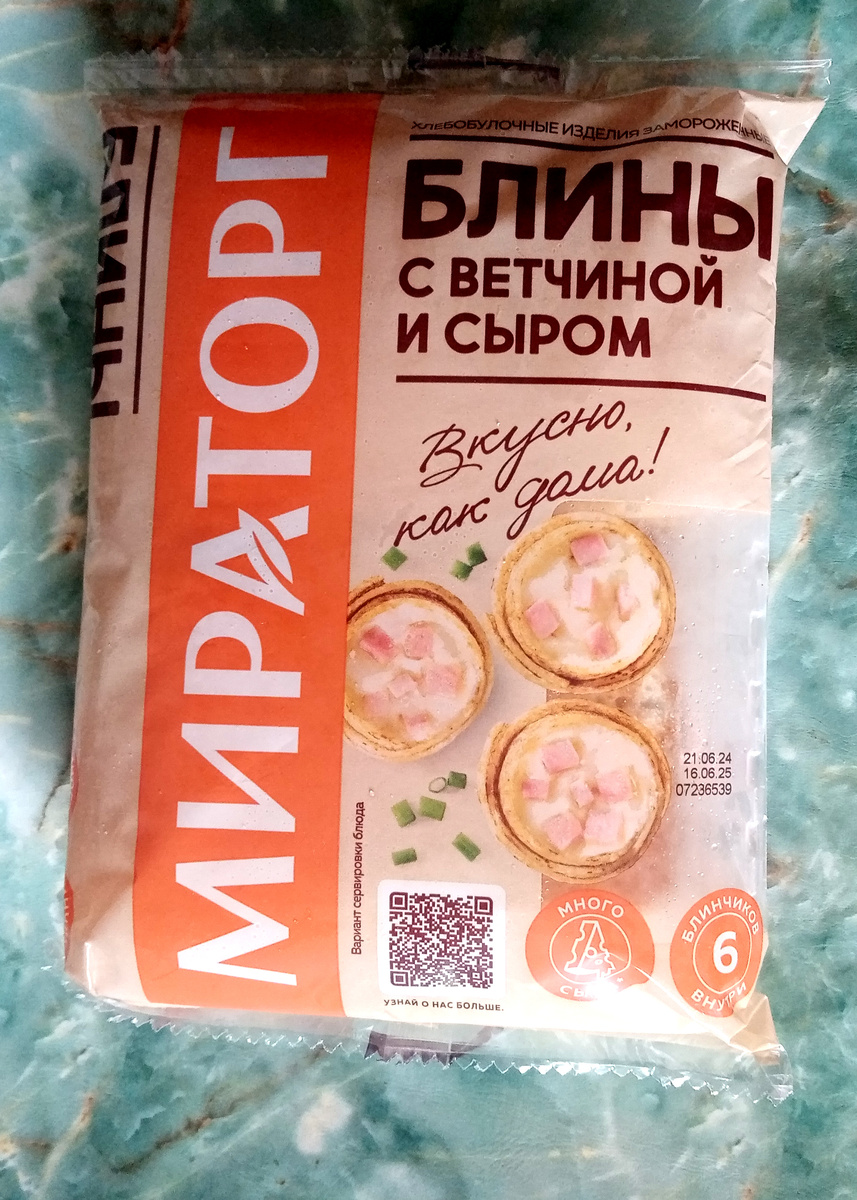 Захотелось чего-то, что можно приготовиь утром, когда торопишься. Знакомая хвалила блины с мясом из магазина "Победа". Но тех блинов, что мне рекомендовали, я не увидела. Решила взять с ветчиной и сыром от бренда "Мираторг". Бренд знакомый, блины с ветчиной и сыром я никогда не покупала. Подумала, пусть будут. Попробую. Вдруг да понравятся. Упаковка флоу-пак с прозрачным "окошком" полукругом. БРЕНД Брянская мясная компания ЦЕНА 127 рублей. ВЕС 360 грамм. Производитель обещает фермерскую ветчину и 2 вида сыра. Информаия напечатана четко, но мелко. Блинчики аккуратненькие. Обжарила на сковороде. Друг к другу не прилипают. На вид аппетитные, стандартного размера. Производитель рекомендует готовить с каждой стороны 2-3 минуты. Но нет, получается дольше, так как за 2-3 минуты.начинка остаётся холодной. Постоянно переворачиваю, по времени готовка занимает минут 10. Состав: начинка (сыр полутвердый с м.д. жира в сух. в-ве 40% (молоко пастеризованное, закваска термофильных и молочно