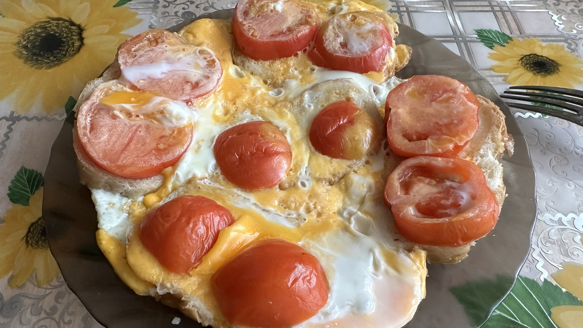 То, что завтракать надо обязательно, я думаю, Вы уже знаете. И в идеале, если это будет полезный завтрак. Но, помимо полезности, он ещё должен быть и вкусным. И сегодня я предлагаю такой рецепт – вкусного и полезного завтрака. А главное, он готовится очень быстро и из того, что есть у под рукой. Все, что нам понадобится – это старый хлеб, помидоры и яйца. Хлеб можно брать любой, как свежий, так и уже подсохший. Его можно порезать кубиками, а можно прямо так, кусочками положить на сковороду, заранее смазанную растительным маслом. Немного поджарить, буквально 1-2 минуты на небольшом огне. Затем нарезаем помидоры. Здесь опять же, кому как нравится. Кто-то любит половинки помидоров, а кто-то нарезает их на квадратики. Равномерно распределяем нарезанные помидоры по сковороде и заливаем все яйцами. После этого немного солим, закрываем крышкой и оставляем на медленном огне жариться в течение 4-5 минут. Можно еще добавить зелень – ну это кому как нравится. Ингредиентов уходит не так много – не