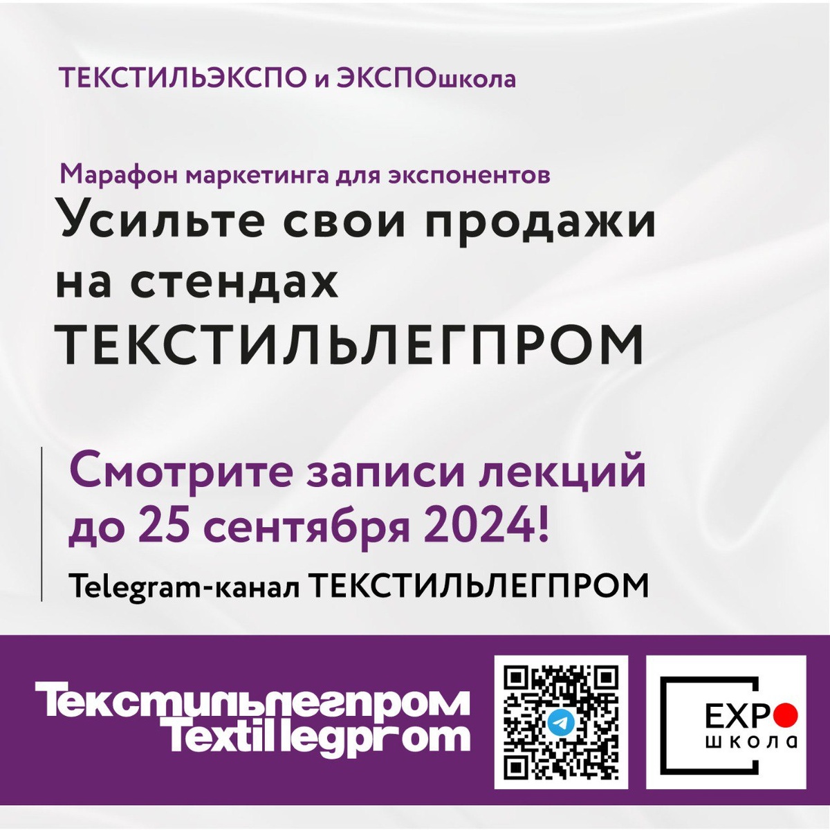 Видеозаписи образовательного марафона маркетинга для экспонентов «Заработай на выставке больше», созданные ЭКСПОшколой по заказу ТЕКСТИЛЬЭКСПО (https://t.me/tlp_textilexpo), доступны к просмотру совершенно бесплатно до 25 сентября, начала выставки ТЕКСТИЛЬЛЕГПРОМ.