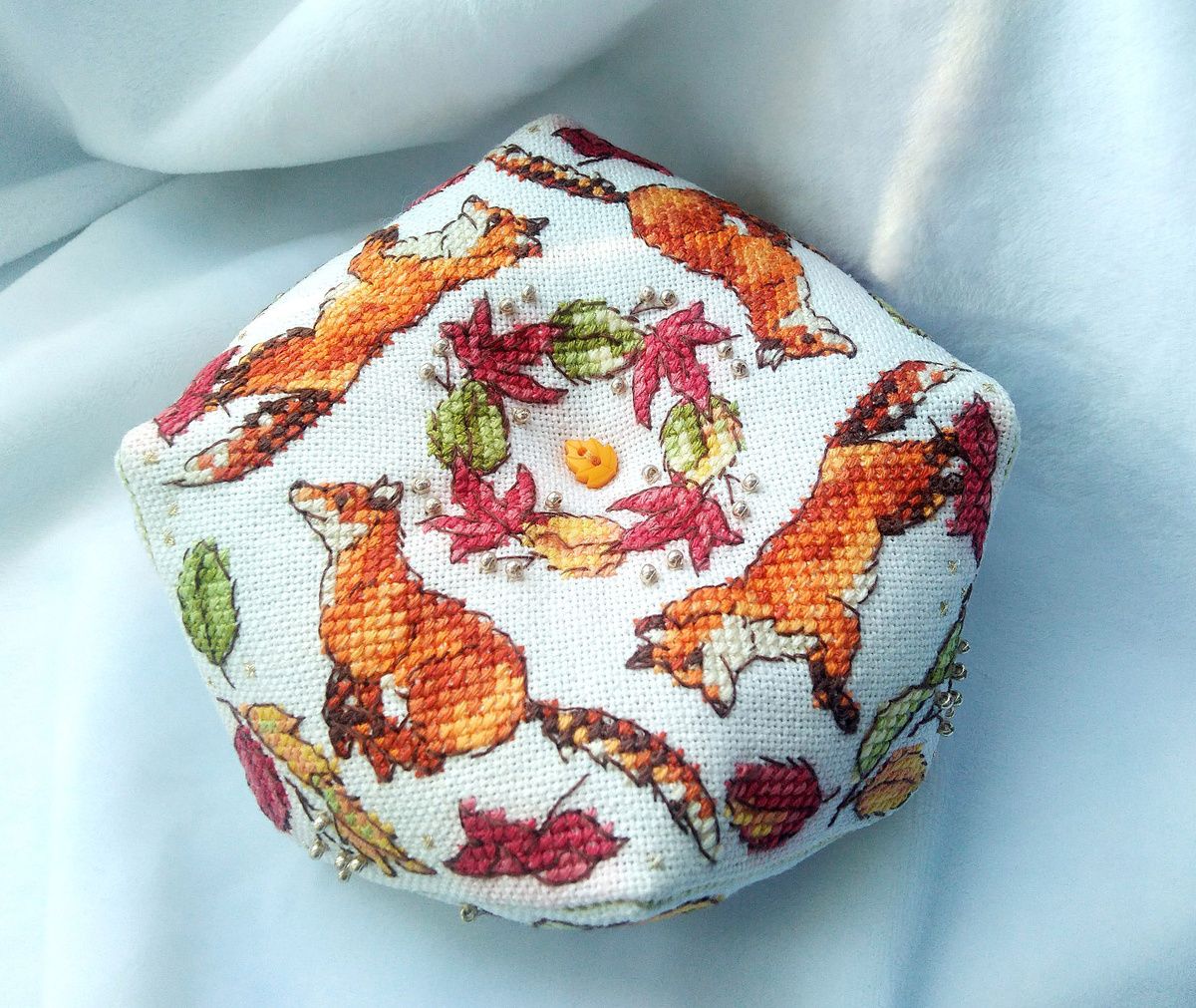 Оказывается, я уже не раз сталкивалась с её дизайнами, просто не знала, кто их создал. На мамин чехол для ножниц меня вдохновило не что иное, как рукодельный набор с павлином от Фаби Райли, просто я не нашла ни автора, ни схемы и вышила на чехле другого павлина. Эта бискорню с лисами давно пленила мой разум, видела я и цветочные подушечки, а когда всё это оказывается на одной странице… Ну, сами смотрите.