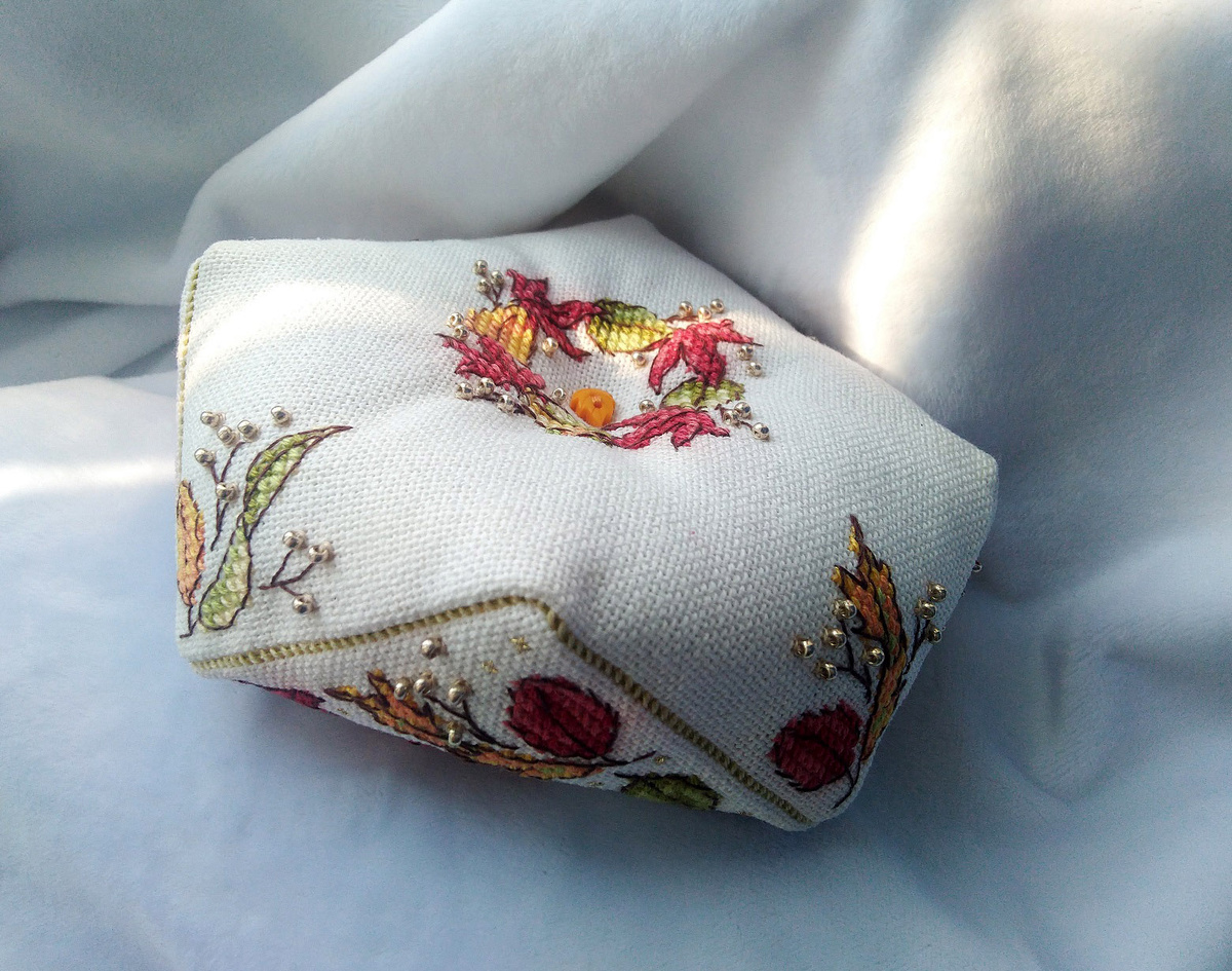 Чудесная подушечка по схеме Фаби Райли. Я получила огромное удовольствие и от вышивки, и от сшивания бискорню, и даже от бисера с металликом.