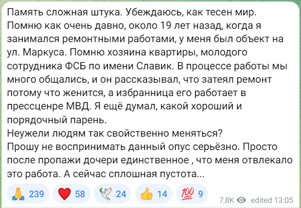 — Помню, как очень давно, около 19 лет назад, когда я занимался ремонтными работами, у меня был объект на ул. Маркуса. Помню хозяина квартиры, молодого сотрудника ФСБ по имени Славик. В процессе работы мы много общались, и он рассказывал, что затеял ремонт потому что женится, а избранница его работает в пресс-центре МВД. Я еще думал, какой хороший и порядочный парень.