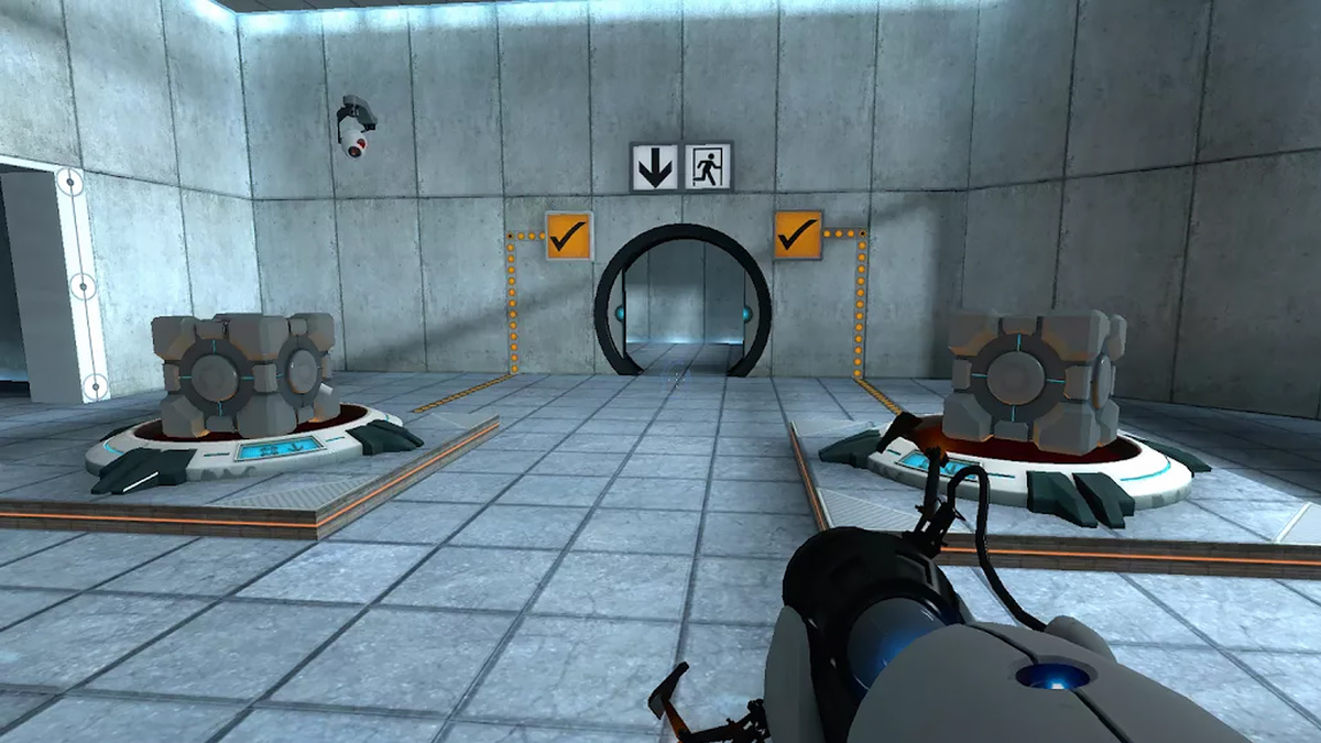 Портальная пушка создаёт две точки в пространстве. Входишь в одну — выходишь из другой. Простая идея, бесконечные комбинации.