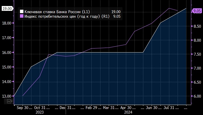 Темпы инфляции в сентябре могут стать аргументом в пользу дальнейшего повышения ставки ЦБ РФ - Альфа-банк Темпы инфляции в сентябре могут стать аргументом в пользу дальнейшего повышения ключевой ставки ЦБ РФ, говорится в обзоре Альфа-банка. "По данным Росстата, рост цен составил 0,1% н/н за неделю с 10 по 16 сентября роста на 0,09% неделей ранее, а по состоянию на 16 сентября цены выросли на 0,18% с начала месяца, - пишут аналитики Наталья Орлова и Валерия Кобяк. - В годовом выражении инфляция составила 8,74% г/г. Следует отметить, что для сентября характерна пониженная инфляция за счет сегмента плодоовощной продукции, тем не менее несмотря на сохраняющуюся дефляцию в сегменте плодоовощной продукции, в целом в продовольственном сегменте рост цен остается на уровне 0,5-0,6% н/н с начала сентября. Таким образом, по итогам сентября инфляция, вероятно, составит 0,4% м/м, что скорее дает аргументы в пользу повышения ставки на октябрьском заседании ЦБ РФ". Настоящее сообщение содержит мнение