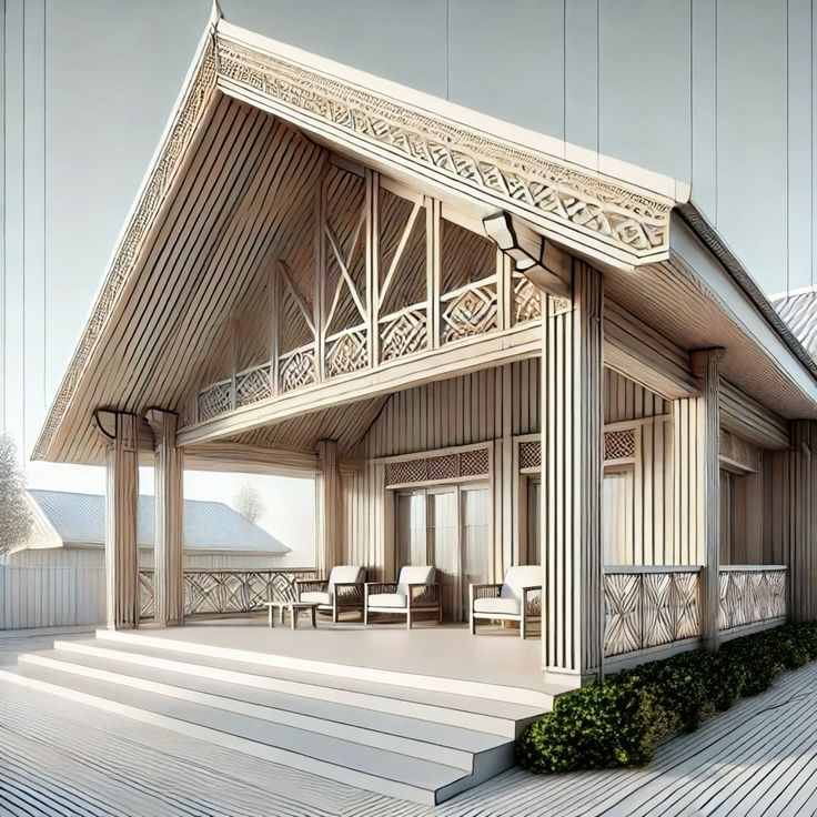 Оформляя фасад дома в русском стиле можно окунуться в традиции и создать дизайн полностью опираясь на старинные мотивы и правила оформления. Но как быть если вы хотите корректно вписать национальный код в современные стили и материалы, сохранить традиции придав им новое видение? В первую очередь на помощь придут материалы. Русский дом, изба, терем это конечно же дерево, тёплое, живое, натуральное. Значит дерево это один из якорей сохранения традиционного стиля. Второй неотъемлемой частью станет резьба. Тут важно вовремя остановиться ... или нет и создать утрированные формы кружевных облаков на окнах дверях и свесах крыши. Выбирая мотивы и резных элементов не поленитесь почитать их значения, тем самым вы сохраните уважение к истории этой традиции и вам точно будет о чем рассказывать гостям. Орнаменты и фигурки служили оберегами, охранявшими очаг и всех живущих в доме от невзгод. Особенно сильными считался Громовой знак — заключенный в круг шестиконечный крест. Знак олицетворял солнце
