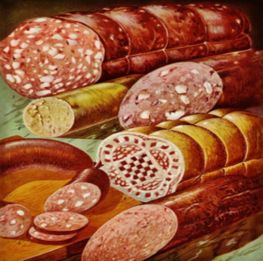 Её производили из высших сортов говядины и нежирной свинины. Во все времена она была, есть и будет однотонной. "Любительскую" же сразу можно было узнать по круглым жиринкам на каждом кусочке. Кстати, рецепт, похожий на "любительскую" колбасу в царские времена назывался "имперским". Также с давних времен была известна "краковская" колбаса с перчиком. Ее мы помним из "Собачьего сердца" Булгакова. Невероятные твердые сорта. Сырокопченой, твердой колбасы в сталинские времена производилось очень мало - 5-10%. Ели ее только столичные жители и подавали в хороших ресторанах. Стоила она дороговато. Среднестатистический человек, увидев ее где-нибудь в санатории на обеде, удивленно спрашивал: "Разве бывает такая?" 👇