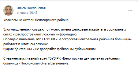В соцсетях расходится псевдозаявление главврача Белогорской Центральной районной больницы Ольги Поклонской о временном ограничении на предоставление медицинских услуг. Якобы введение таких мер в крымском медучреждении обусловлено проблемами с электроэнергией и изъятием генераторов. Как на самом деле Информация не соответствует действительности. Ложное заявление опубликовали с новодельного аккаунта в соцсети, который был создан три дня назад. Фейковая страница ранее принадлежала некоему «Кириллу Барвинскому». Позже профиль переименовали и добавили фото главврача. Настройки приватности при этом изменили и сделали страницу закрытой. Фейковость сообщения выдает и украинское написание слова «электрогенератор» через первую «е». На своей официальной открытой странице реальный главврач Белогорской Центральной районной больницы сообщила, что злоумышленники от ее имени распространяют ложную информацию, а медучреждение работает штатно. Министерство здравоохранения Крыма также подтвердило, что бол