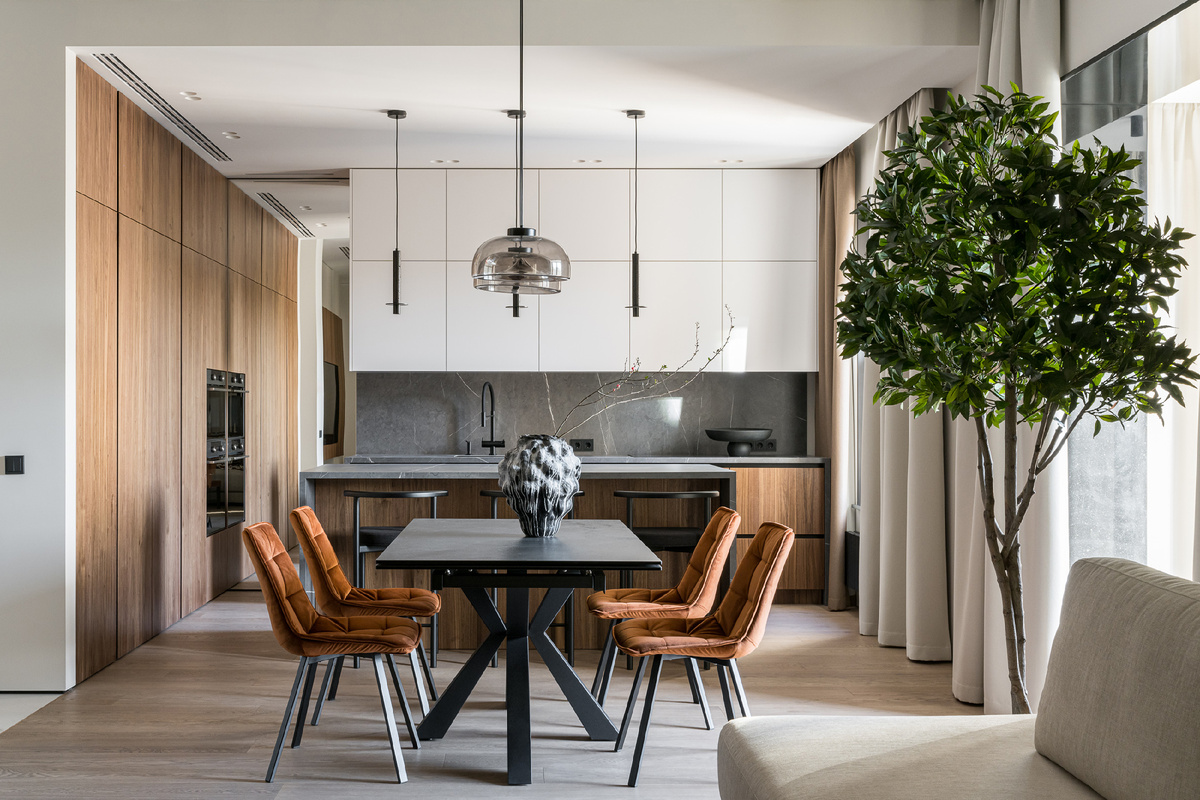 Квартира для молодой семьи с динамичным образом жизни. Интерьер создан как «тихая гавань», где можно расслабиться, наполнится энергией и спокойно провести время всей семьей. Площадь квартиры: 140 м2 Эстетика и детали интерьера вдохновлены культурой Китая. Cозерцание, любовь к природе, баланс, медитативное состояние, когда вся суета внешнего мира перестает иметь значение. Поэтому интерьер выполнен в спокойной природной цветовой гамме с использованием дерева и каменных фактур. В квартире площадью 140 м2 было важно спланировать личное пространство для каждого и вместе с тем уделить особое внимание вместительной кухне-гостиной — месту притяжения всей семьи. Просторная, лаконичная, удобная кухня-гостиная рассчитана и для приема гостей, и для семейных вечеров. Благодаря присоединению балкона площадью 8 м2, появилось уединенное место для отдыха, зонированное текстилем.