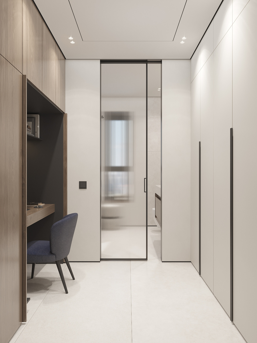 Эту идею нам подсказал сам заказчик, сами бы мы не решились. Сделать кабинет проходным в... ванную комнату! Здесь была зона гардероба, дальше по коридору - санузел. Нужно было куда-то вписать рабочую зону и заказчик говорит: «Подумайте в этом направлении». Рабочий стол мы скрыли мебельными фасадами. И никто не догадается, что там кабинет. Из транзитного кабинета попадаем в гостевой санузел. Таким образом, если будут гости, импровизированный кабинет просто закрывается. Нам часто под реализованными проектами пишут, что что-то неудобно, неправильно и тд.