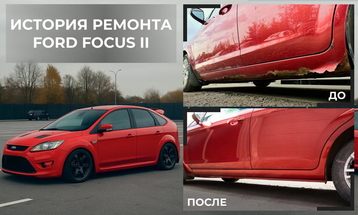 Как отремонтировать Ford Focus 2? Рассказываем и показываем на примере авто, который приезжал к нам в мастерскую. Есть мнение, что машину, у которой больше четырех поврежденных элементов кузова, проще продать, чем восстановить. Мы не согласны! Во-первых, потому что ситуация на вторичном рынке сейчас не самая благоприятная для покупателя: цены на авто с пробегом растут, а найти машину в более-менее сносном состоянии сложно. Во-вторых, восстановление авто - не такой уж трудоемкий и долгосрочный процесс, каким его некоторые представляют. Сегодня мы докажем это на примере Ford Focus 2. К нам в мастерскую поступил Форд Фокус 2, хэтчбек 2010 года выпуска. Так как прошло 14 лет, авто начал подгнивать в области порогов, арок и дверей. На фото можно увидеть среднюю степень коррозии: Кузов у него оцинкован. Но и оцинкованный металл можно повредить: тогда железо начнет постепенно ржаветь. Достаточно одного ДТП, чтобы дать дорогу коррозии. Причем за счет того, что и металл, и заводская обработка,