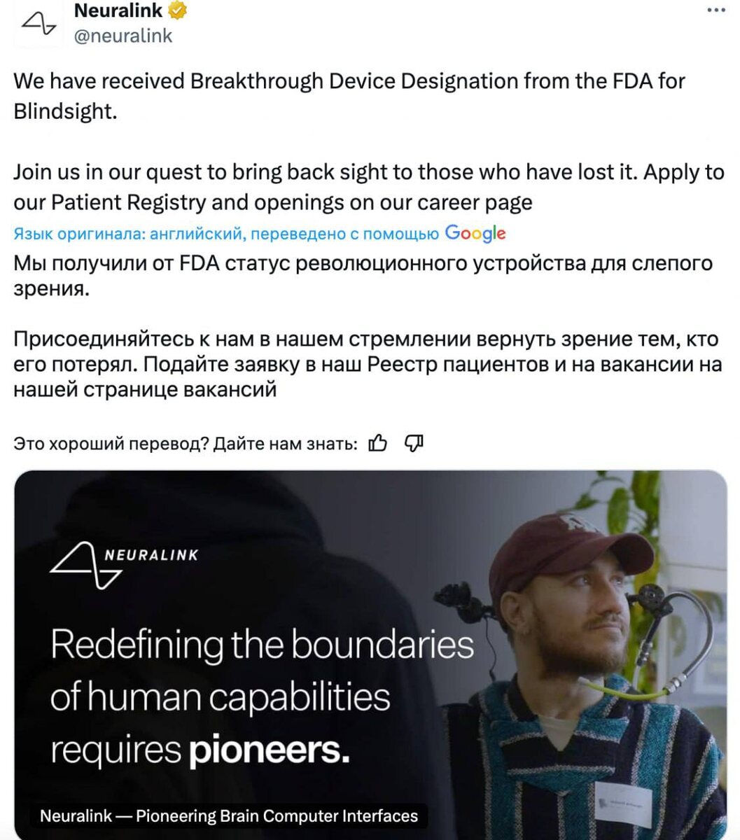 Привет зрение. Neuralink Илона Маска получил одобрение от FDA как средство возврата зрения. Технология Blindsight позволяет даже от рождения слепым людям вернуть зрение - она напрямую возвращает сигнал от глаз к мозгу. А если даже глаз нет, вместо них выступают камеры - достаточно живой зрительной коры и все будет работать. Просто фантастика. Исследования на людях вот вот начнутся - Neuralink уже ищет первых добровольцев