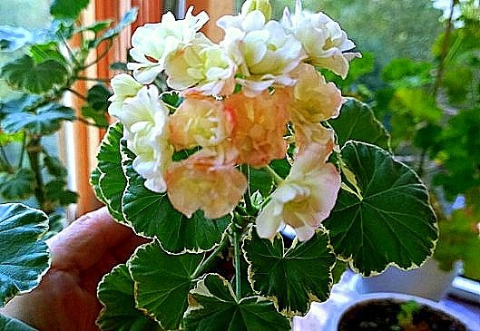 Не беспокоила я её до сегодняшнего дня. Цвела она себе и цвела. Всё лето с начала мая. Сначала робко, выпустив только одну розочку, и этим показала, что лето уже готова встречать. Ждать долго не пришлось. Бутоны появлялись один за одним, раскрываясь розочками, собранными в пышный букет. В этом году яркость её лепестков была особенно заметна, такой я увидела её впервые. Зональная пеларгония Uato Ringu не прихотливая. Ей нужен только объёмный горшок потому как куст вырастает крупным, яркое солнышко, конечно, ну и своевременный полив, который она очень любит. В летнее время - подкормки периодические. Наличие этих простых условий превращают розебудку в самодостаточный куст с яркой розовой кромкой на лепестках и узкой белоснежной каймой по краю листьев. Именно такое сочетание листьев и цветов делает её любимицей цветоводов. Вывели сорт в Японии в 2020-м году, и он до сих пор пользуется огромным спросом у нашего населения. Считаю, что всё это благодаря такой благородной светлой каёмке. За