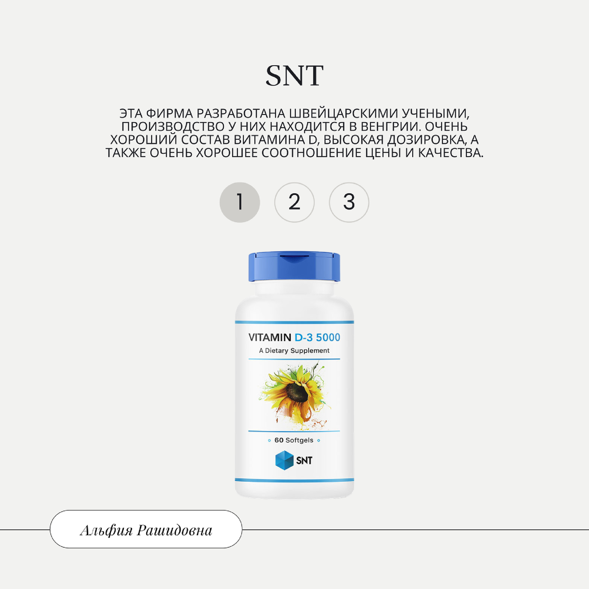 В продолжении темы витамина D3, я хочу поделиться с вами моими любимыми брендами. Первое место занимает бренд SNT. Эта фирма разработана швейцарскими учеными, производство у них находится в Венгрии. Очень хороший состав витамина D, высокая дозировка, а также очень хорошее соотношение цены и качества. На втором месте у меня бренд Now Foods. Это США и их тоже вы можете найти в открытом доступе. У них очень хороший состав, и в то же время есть капсулы с хорошим, высоким лечебным содержанием витамина D3. Ну и на третьем месте бренд Solgar. Тоже очень большой спектр по дозировке 5000-10000 и очень хорошее соотношение цены-качества. Все эти три фирмы являются у меня фаворитами 💚