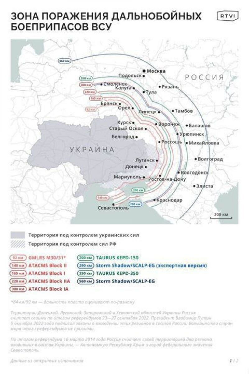 Телеграм-канал «Русское оружие» (t.me/RussianArms) опубликовал актуальную тактическую карту с секторами риска, которые охватывают крылатые ракеты SCALP-EG / «Storm Shadow» в экспортной (до 290 км) и штатной версии (до 560 км). Это связано с утвержденным в ходе голосования Европарламента призывом к руководствам государств-участников НАТО предоставить Киеву неограниченные полномочия на удары по тыловым стратегически важным объектам ВС РФ в регионах Европейской части России. Под угрозой ударов экспортными вариантами ракет находятся Воронеж, Смоленск, Брянск, Белгород, Курск, Липецк, Орел и Калуга. В случае со штатными под угрозой оказываются Москва, Тула, Рязань, Тамбов, Тверская и Псковская области. Для своевременного перехвата ракет потребуется развернуть более 15 дополнительных дивизионов зенитно-ракетных комплексов «Бук-М3» и С-400, оснащенных специальными радарами подсвета 9С36М, а также вышками 40В6МД, рассредоточенными на удалении 50 — 60 км друг от друга для перекрытия низковысотн