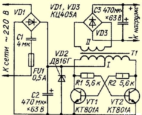 Простой сетевой блок питания можно построить своими руками, при этом не имея большое количество радиоэлементов. Ниже будет рассмотрена конструкция простого импульсного блока питания, построенного на отечественных компонентах, хотя все исходные компоненты можно и заменить на импортные. Самой главной частью любого блока питания - является импульсный трансформатор, поэтому на его намотку следует обратить большое внимание источник. Трансформатор в данном случае намотан на ферритовом кольце марки 1500НМ1, размеры кольца К40х25х11. Первичная обмотка содержит 320 витков с отводом от середины, т.е 160 витков на плечо, провод с диаметром 0,49 мм марки ПЭВ, вторичная обмотка содержит -72 витка провод 0,8 мм той же марки. Количество витков вторичной обмотки подбирается исходя от нужного на выходе напряжения. Диодный мост на входе и в выпрямительной части (на выходе) можно поставить кц405 или любые 4 диода с напряжением выше 250 вольт. Стабилитрон предназначен для стабилизации выпрям