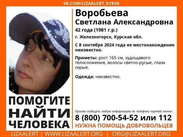 Вечером 19 сентября поисковый отряд «Лиза Алерт Курск» распространил ориентировку на поиски 42-летней жительницы города Железногорска По данным волонтеров, пропала Воробьева Светлана Александровна. Ее местонахождение неизвестно с 8 сентября. Приметы: рост — 165 см, телосложение худощавое, светло-русые волосы, серые глаза Одежда: неизвестно. Сергей Яшин, по материалам https://vk.com/lizaalert_kyrsk Постоянный адрес новости на сайте «Друг для друга» ~ https://dddkursk.ru/lenta/2024/09/19/112141/. Новости Курска за ~ 19 сентября ~ сентябрь 2024 года.