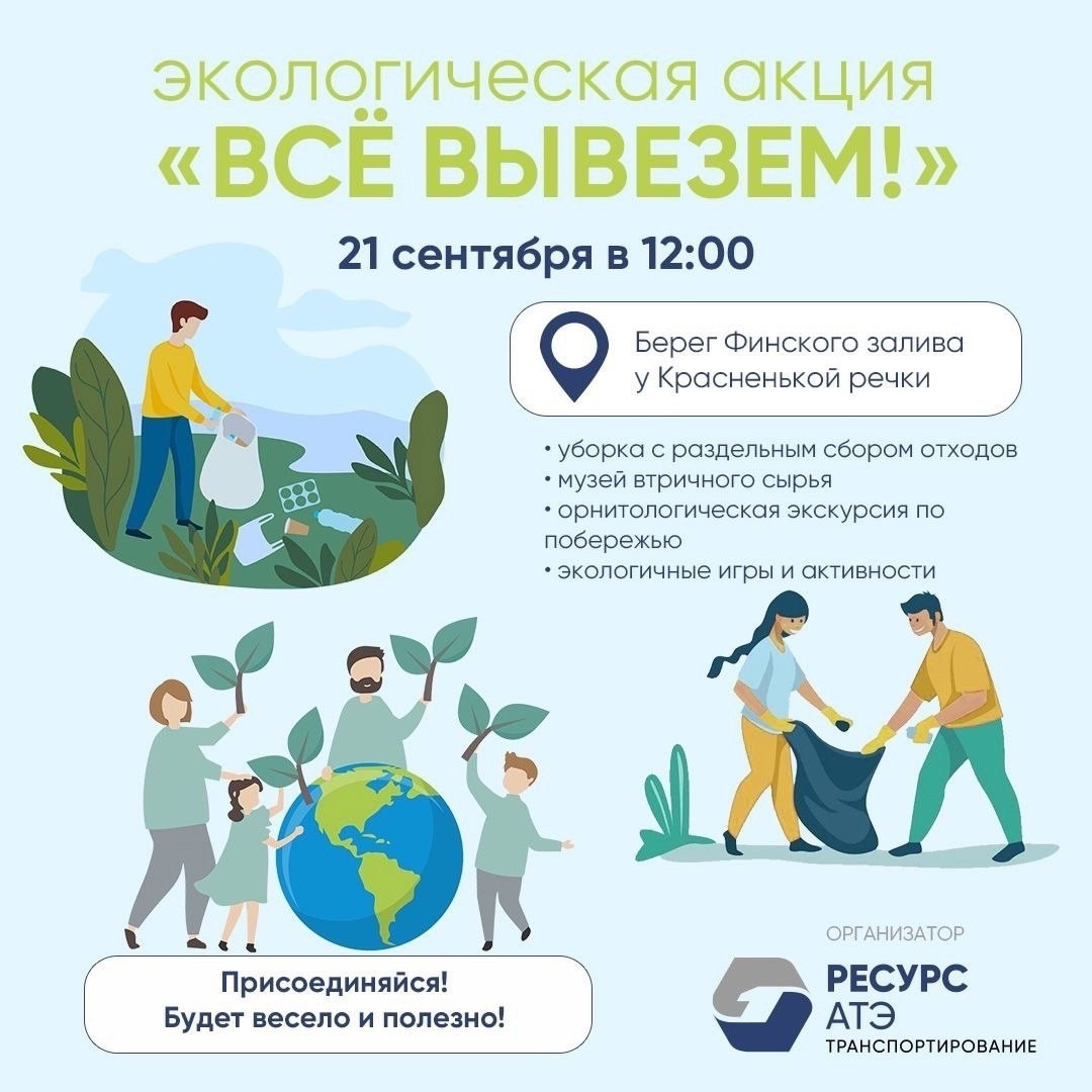 21 сентября в 12:00 на берегу Финского залива, в устье речки Красненькая пройдёт субботник. На мероприятии анонсированы: * Уборка с раздельным сбором отходов