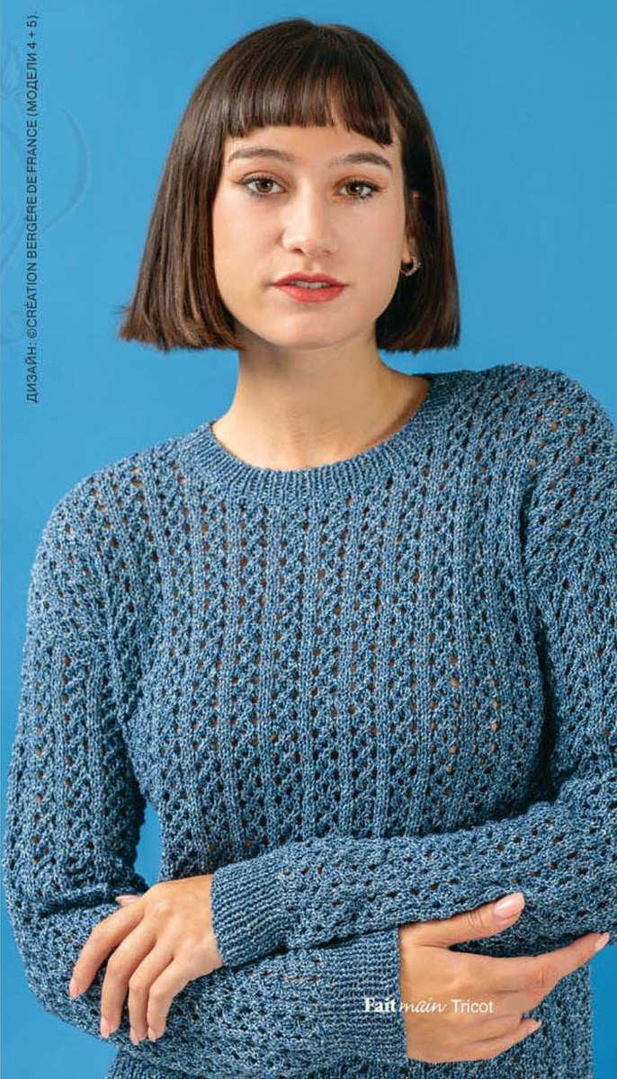 Загадка должна быть не только в женщине, но и в ее наряде. Пуловер с геометрическим узором в благородной синей гамме выполнен в технике интарсия. Это очень удобно: вы можете вязать большие участки лицевой гладью нитями разных цветов. Широкий круглый вырез, низ модели и рукавов три четверти подчеркнуты упругой резинкой.