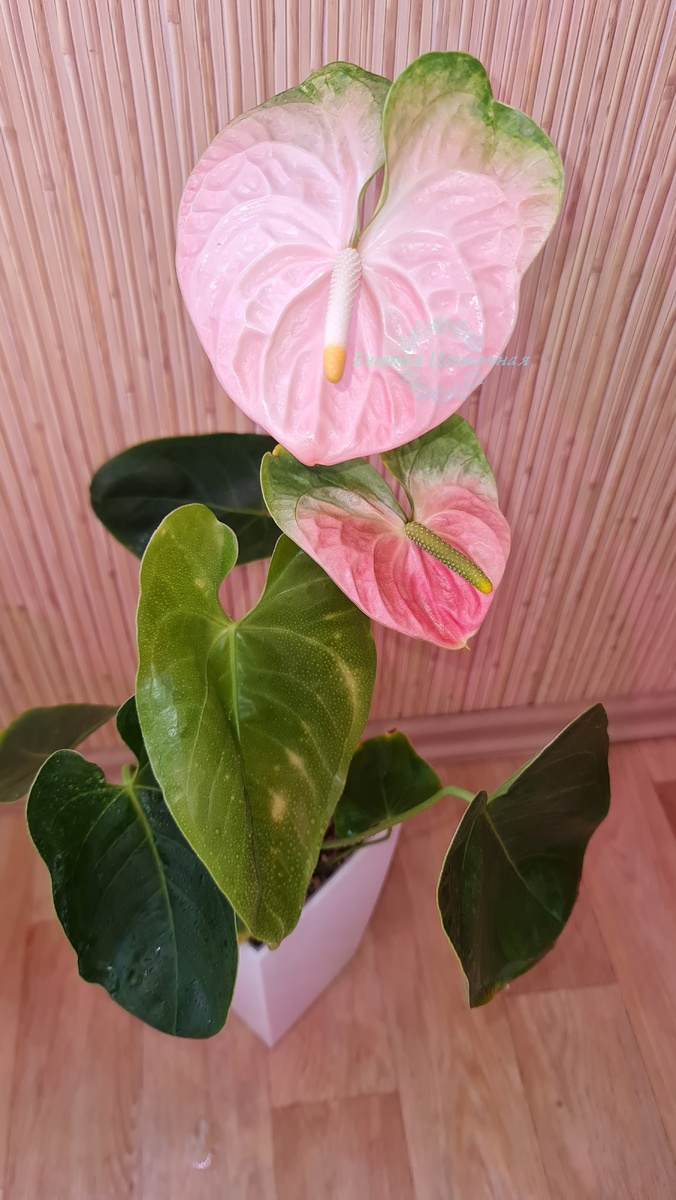 Габриэлла - однин из потрясающих голландских сортов антуриумов. В нем прекрасно все, от округлых форм листьев до изящного початка. Гармоничный куст, соотношение листвы к прицветникам. Неприхотливость в уходе и невероятная нежность соцветий. Покрывало окрашено мягкими переходами от более с ветлых к насыщеным розовым оттенкам. Изюминка сорта- зеленые "ушки" прицветника. В моей коллекции сорт появился всего год назад, малюсенькой деткой, поэтому к сожалению пока не могу показать все великолепие взрослого куста. Знаю, что прицветники должны быть еще гараздо крупнее размером, чем на моих фото. На данный момент они не более 15 см. Но для первого цветения и это шикарно. Особенно если учесть, что ровно год назад все растение было неболее 15 см и без единого корешка. Менее чем за год, антуриум успел нарастить корни, набрать сильную зеленую массу и так шикарно зацвести. Очень рекомендую в коллекцию. Редкое сочетание красоты и неприхотливости.