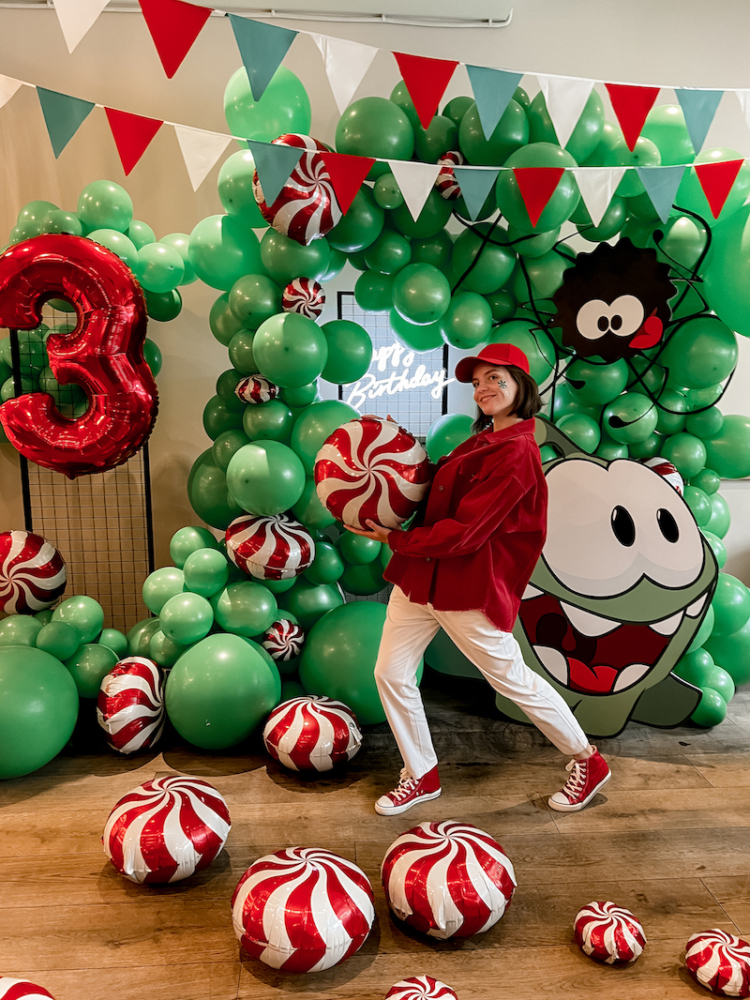 Мы устраиваем праздники даже на самые необычные тематики! Например, нашей 3-летней имениннице очень нравится лягушонок Ам Ням из игры Cut the Rope. Кстати, про него снимают мультики, которые девочке очень нравятся. Праздник отмечали в лофте, где мы оформили праздничный стол и сделали огромную фотозону из зелёных шариков и фольгированных леденцов. Их же мы раскидали на полу, чтобы оживить пространство! А под потолком мы развесили наши фирменные флажки — их мы изготавливаем на заказ для ваших праздников, в нужной гамме, чтобы они сочетались с остальным декором. Для сервировки мы использовали базовую коллекцию Meri Meri — простые красные тарелочки, которые прекрасно подошли к нашей гамме праздника. На столах мы рассыпали конфетти и добавили тематические сладости: печенье и леденцы. Фотозону мы украсили героями Cut the Rope., фольгированной цифрой и неоновой надписью. Мы продумали и анимационную программу: были игры на любой вкус, чтобы никто не скучал. Больше всего детям понравилась бумаж