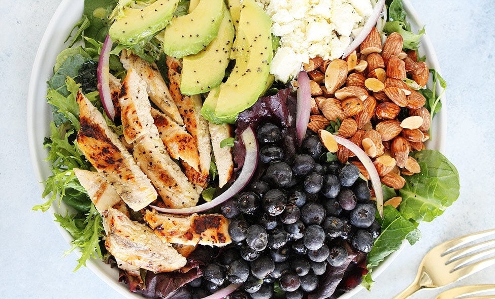 Салат из курицы-гриль с черникой, сыром фета и заправкой из лимона и мака