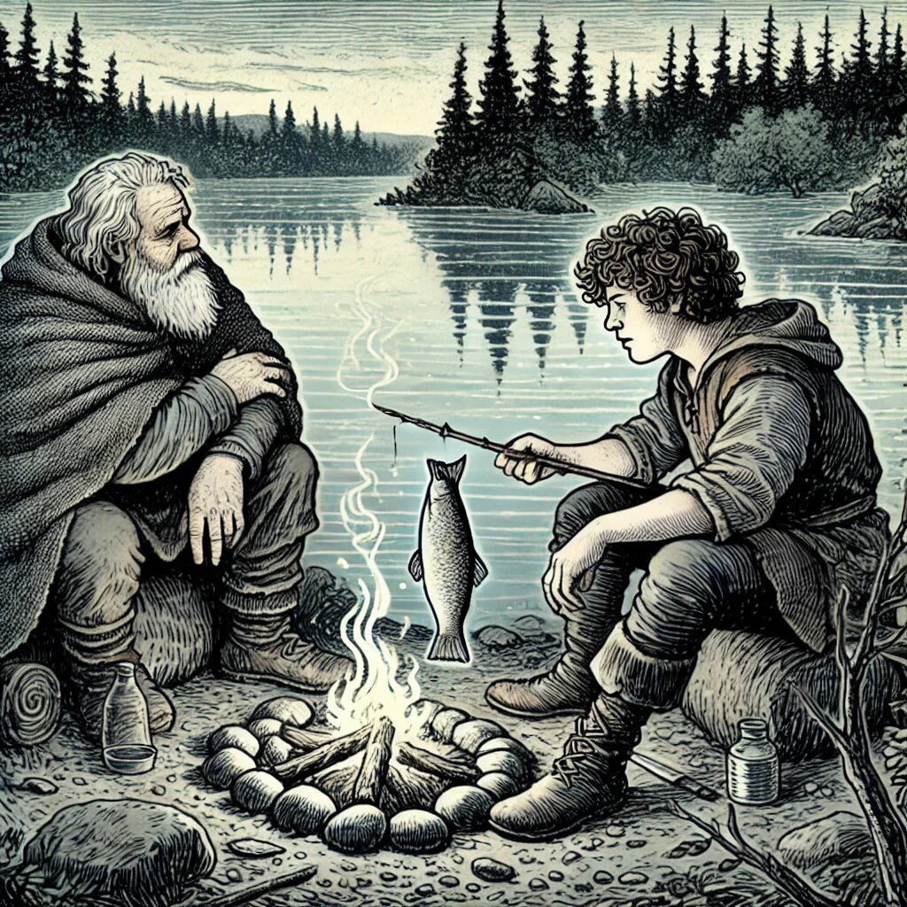 Когда Алексей проснулся, дед уже не спал. Сидя на камне, он молча глядел на гладь озера, погрузившись в свои мысли.