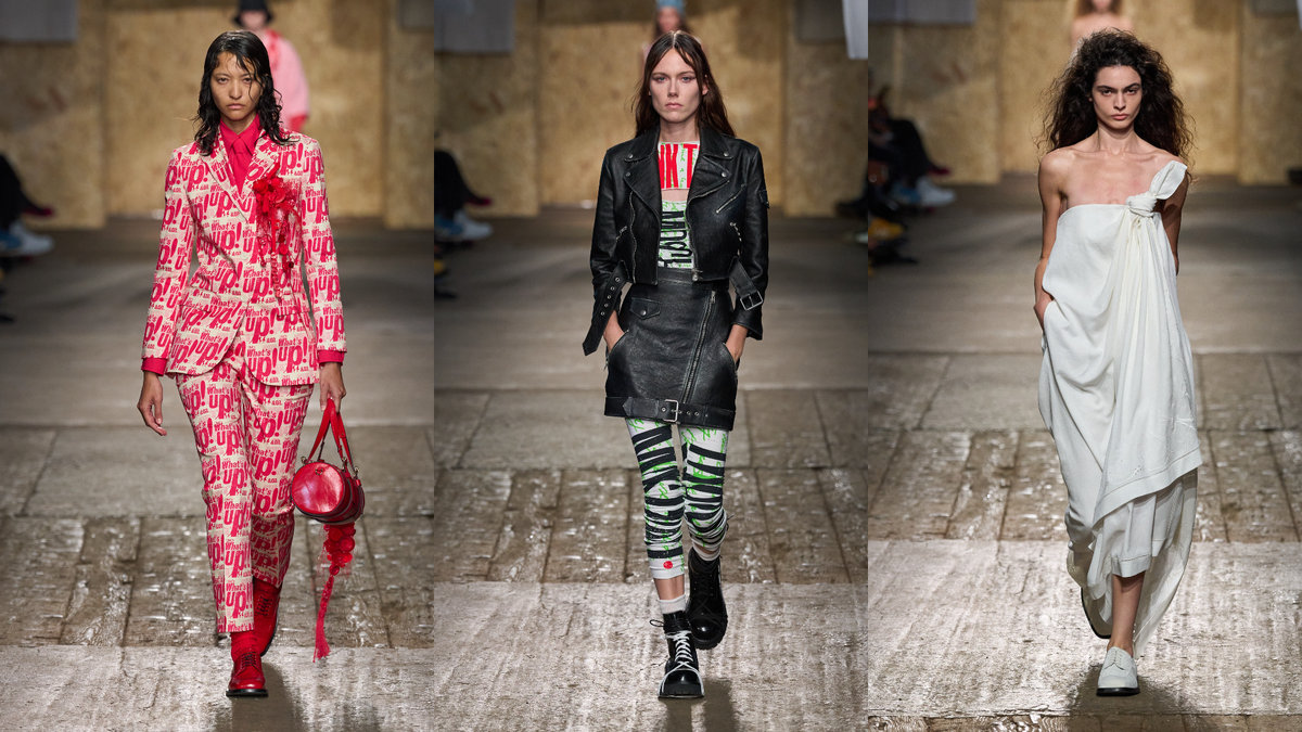 Адриан Аппиолаза, новый дизайнер, который уже работает третий сезон в Moschino, является перфекционистом в мире моды. Он стремится не только переосмыслить наследие основателя дома Франко Москино для современной аудитории, но и передать все свои знания о трендсеттерах и стилях прошлых десятилетий тем, кто внимательно следит за его творчеством. Его показ сегодня был своеобразным модным путешествием по субкультурам, тщательным исследованием различных модных группировок от человека, обладающего дотошным взглядом на детали. Шоу началось с группы образов, выполненных в белом цвете: это была связь между данной коллекцией и его дебютом в феврале. Силуэты с драпировками были вдохновлены фотографией, на которой Франко Москино обматывает манекен тканью, найденной Аппиолазой. Далее он сделал отсылки к другим своим иконам, пригласив Терри Джонса, сооснователя журнала *i-D*, разработать графические слоганы в его фирменном стиле для футболок и леггинсов, а также сотрудничая с Judy Blame Trust, чтобы