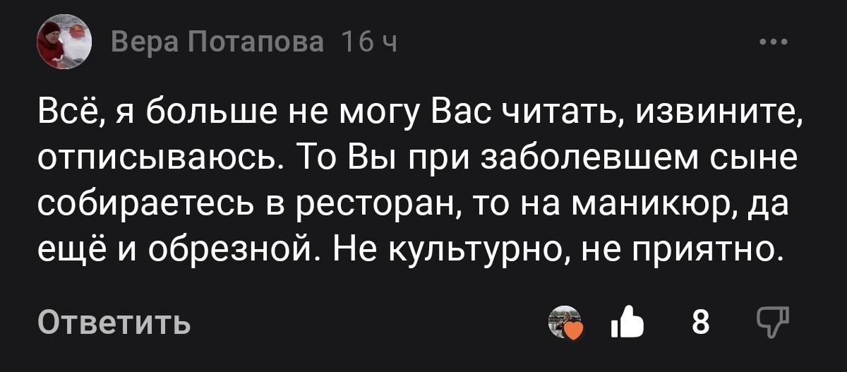 С утреца прилетело 👇: Вот Вера решила, что если ребёнок болеет, то нельзя делать больше нечего, кроме как сидеть рядом с ним и молиться. Но Гриша, хоть и болеет, его образ жизни не изменился. Он ходит и в бассейн, и на пляж, а не лежит в номере. У него изредка кашель, но нет температуры и с виду он живее всех живых. Так что если вы себе не можете позволить оставить больного ребёнка с мужем и поехать по делам, это вопрос к вам. Как многое вы запрещаете себе в жизни под мнимыми предлогами? Кто вас оставил в нужный момент, когда вам нужна была помощь? Интересный запрос для психотерапевта. 😉 Теперь про ресторан. Это был ресторан при отеле, и каждому, кто купил "всё включено", давали там один вечер. Типа в подарок. Муж идти не хотел, а я решила, что не хочу терять возможность поесть еду из красивой посуды. Сына тоже взяли с собой, естественно. Когда мы пришли, нам подали какие-то суховатые рулеты. Честно, как бутерброды с черствым хлебом. Потом нам подали то, что каждый выбрал. Гриша ел
