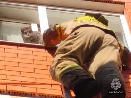 Пожарные МЧС России по лестнице забрались на 3-й этаж и пытались вытащить питомца. От испуга кот начал оказывать сопротивление и сам запрыгнул внутрь.