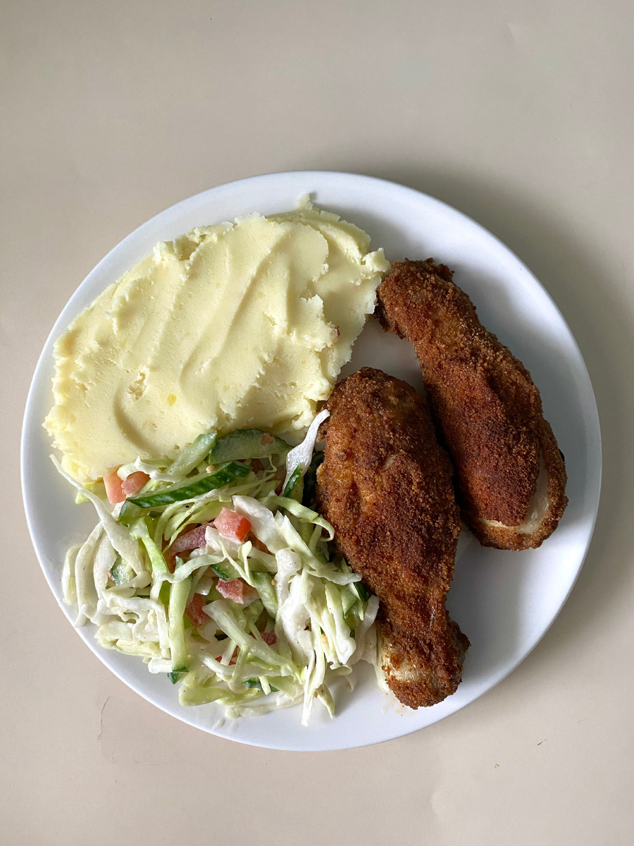Ингредиенты: Голени 1,5 кг 10 гр соли (1 ч.л с небольшой горкой) Перец черный молотый 1/2 ч.л карри 3 ст. л майонеза 2 ч.л горчицы русской 4-5 зубчиков чеснока Панировочные сухари Приготовление: