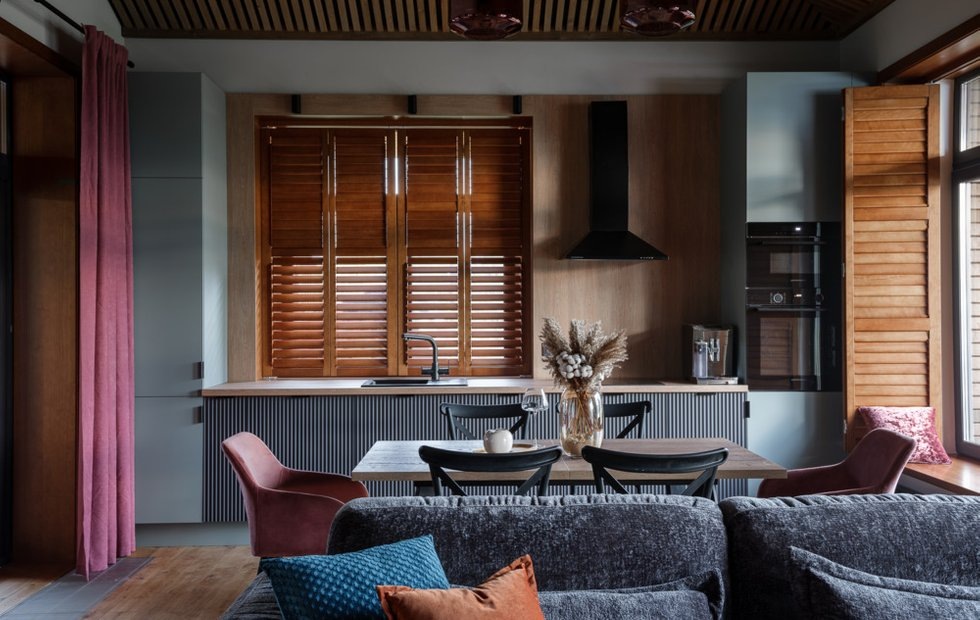 Удобные подоконники для сидения, шаттерсы на окнах и деревянный реечный потолок — смотрите эти и другие фишки загородного интерьера