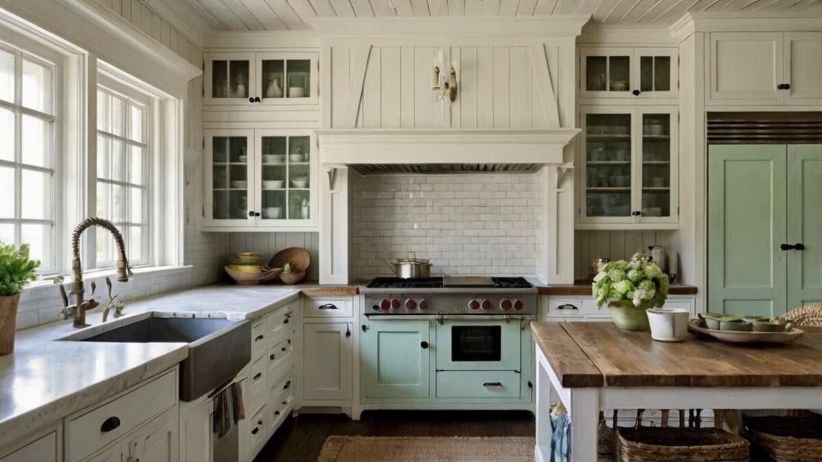Пляжная кухня получает винтажный шарм благодаря панельным шкафам сокрашенными петлями и черными зажимами. Вычищенные дубовые полы в этой кухне от Тэмми Коннор создают легкое и воздушное ощущение. Шкафы в пляжном стиле могут добавить расслабляющую атмосферу в ваше пространство, создавая идеальное место для отдыха и общения. Этот стиль отлично подходит для тех, кто ценит легкость и свежесть в интерьере. Ещё больше идей на нашем сайте или в телеграмм канале "Кухонные инсайды"