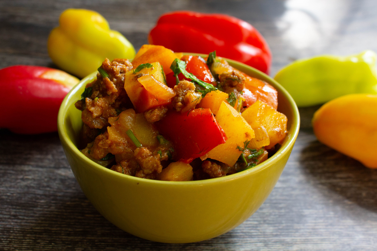 Блюдо из разряда - что приготовить из фарша без особых хлопот. Для приготовления подойдут любые овощи, которые предпочитают в вашей семье. Количество овощей условное, всегда можно добавить больше тех овощей, которые вам хочется на данный момент. Фарш можно использовать любой: свиной, говяжий, баранина, смешанный. Если под рукой нет готового бульона, можно вполне обойтись водой, будет тоже вкусно. Блюдо получается яркое, сытное, вкусное и ароматное. Чтобы блюдо было ярче, используйте болгарские перцы разных цветов. Фарш мясной - 300 г. Лук репчатый - 1-3 шт. Картофель - 3-4 шт. Морковь - 1-2 шт. Перцы болгарские - 3-4 шт. Бульон - 400 мл. Томатная паста - 1 ст.л. Сливки или каймак - 100 мл. Масло растительное - 3 ст.л. Паприка сладкая - 1 ч.л. Перец черный молотый, соль, зелень - по вкусу Лук мелко нарежем и обжарим на растительном масле до мягкости и румяного цвета. Добавим фарш к луку и готовим все вместе 2-3 минуты. Постоянно помешиваем, чтобы фарш не схватывался в крупные комочки. Д
