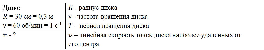 Диск радиусом 30 см равномерно вращается относительно оси, проходящей через его центр, с частотой 60 об/мин. Чему равна линейная скорость точек диска, наиболее удаленных от его центра?