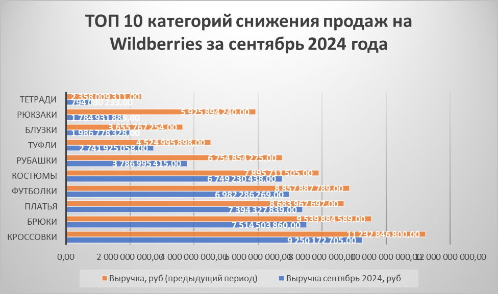 Анализ категорий с падением продаж на Wildberries в сентябре 2024 года В сентябре 2024 года некоторые популярные категории на Wildberries столкнулись с падением продаж. Рассмотрим ключевые показатели: Итоги: Падение продаж в большинстве случаев связано с сезонными изменениями — по мере наступления осени покупатели переориентируются на более теплую одежду и обувь, а также завершается активная подготовка к учебному году. Раскройте потенциал вашего бизнеса с помощью AIF! В современном мире конкуренция становится все более жесткой, и успех зависит от способности принимать решения на основе данных. Наши эксперты проводят глубокие аналитические исследования, которые предоставляют вам доступ к актуальной информации о рынке, потребителях и конкурентной среде. С аналитикой от AIF вы получаете не просто данные, а практические рекомендации для достижения ваших бизнес-целей. Закажите исследование уже сегодня, и вы выведете свой бизнес на новый уровень эффективности и прибыльности! Свяжитесь с нами